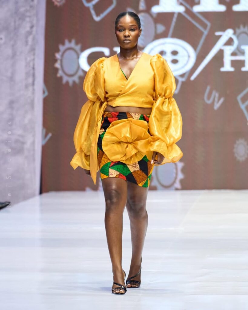 A bold yet graceful pairing of a voluminous golden silk blouse with statement puffed sleeves, matched with a tailored Ankara mini skirt. The oversized rosette detail at the waist adds drama, making this a perfect balance of modern chic and traditional flair. Contact HN Clothings to indulge in luxury fashion tailored to your unique style.